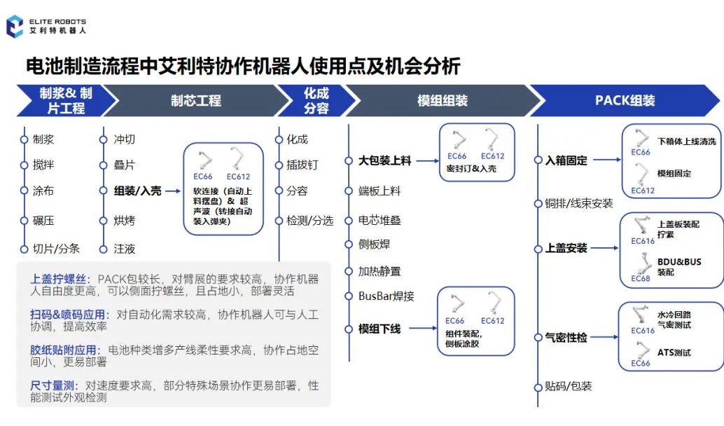 電芯段:為保證生產(chǎn)效率及產(chǎn)品一致性,疊片、焊接、封裝等工藝段協(xié)作機器人滲透率較高。主要用于電芯組裝中的電芯入殼搬運、頂蓋焊接搬運、組盤、注液搬運等,協(xié)作機器人布置更加靈活,不同機臺適應(yīng)性強。
