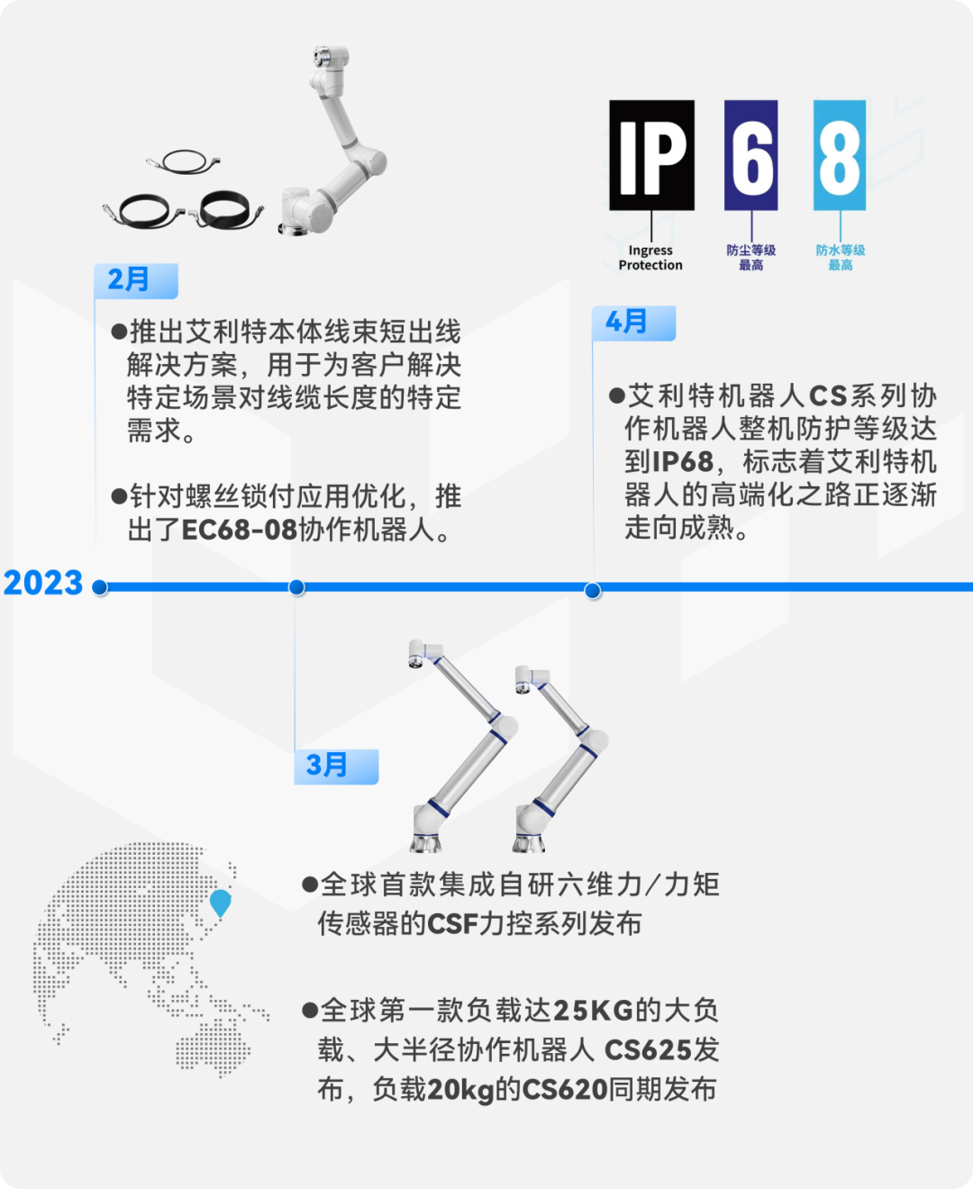 2023年,艾利特機器人在技術上全力進階前行,針對應用持續拓展產品矩陣,推出6大全新系列協作機器人,讓艾利特產品矩陣拓展至8大系列:穩定可靠的EC系列,性能卓越的CS系列,自研六維力傳感器的CSF系列,高精高速的CSA先進系列,碼垛專家CSH地平線系列,不懼高危環境的CS防爆系列,以及為打磨、螺絲鎖付、焊接、切割等而生的CSR回轉體系列,售價親民的EA系列。