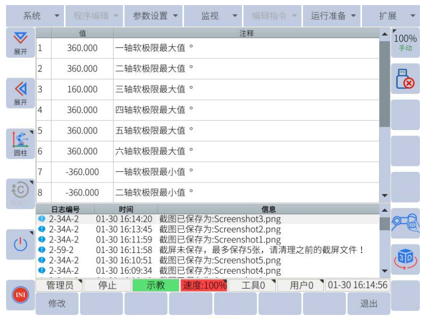 軟極限可以限制每個關節的旋轉極限。導航 參數設置 -> 軟極限設置 除了3軸極限為正負160°其他軸極限均為正負360°。