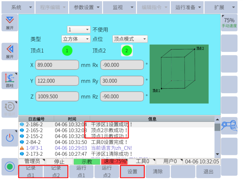 3. 選擇“頂點 1”,用軸操作鍵移動機器人到立方體的頂點 1,點擊“記錄點 1”。