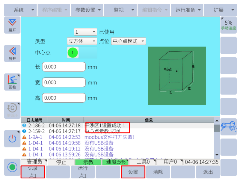 3. 選擇“中心點”,用軸操作鍵移動機器人到立方體的中心點位置,點擊“記錄點 1”。