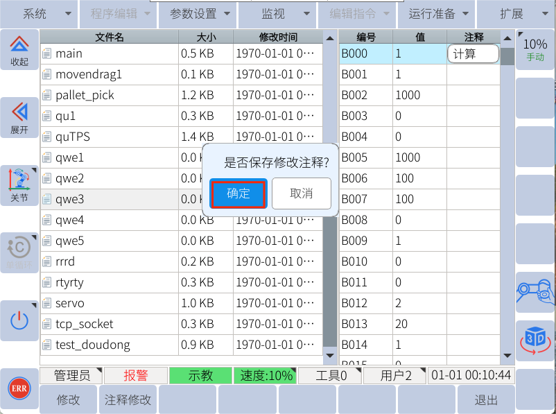 機器人在調試過程中經常會使用到全局變量和IO信號,在手動測試過程中為防止忘記變量和IO信號的功能,一般會在后面增加對應的注釋,EC示教器上的全局變量(D,B,I,V,P)均可以人為修改注釋(支持各類語言),數字IO,模擬量IO,M虛擬輸入和輸出也均支持修改注釋