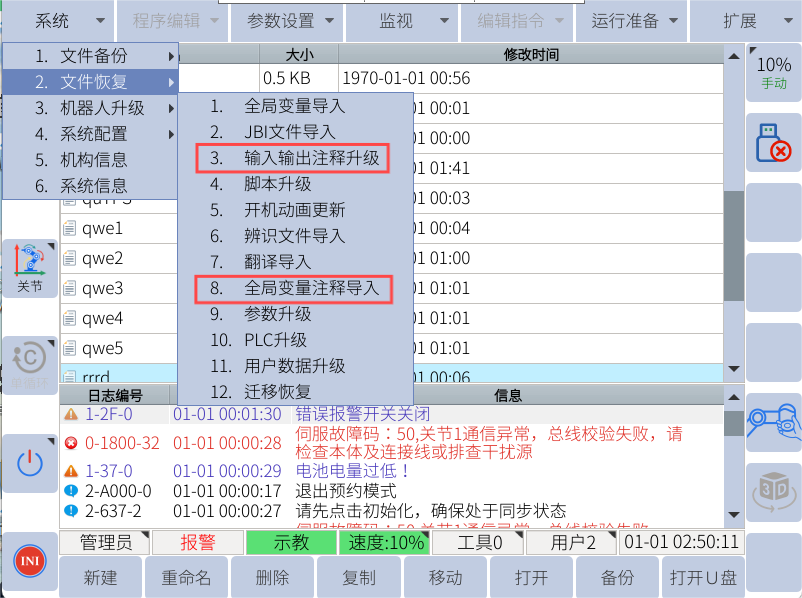 1.操作文件備份或者恢復時,示教器上無全局變量注釋或者輸入輸出注釋的選項