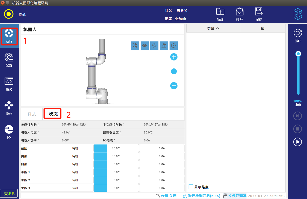 ● 機器人顯示”待機“狀態后退出,進入運行頁面,切換狀態