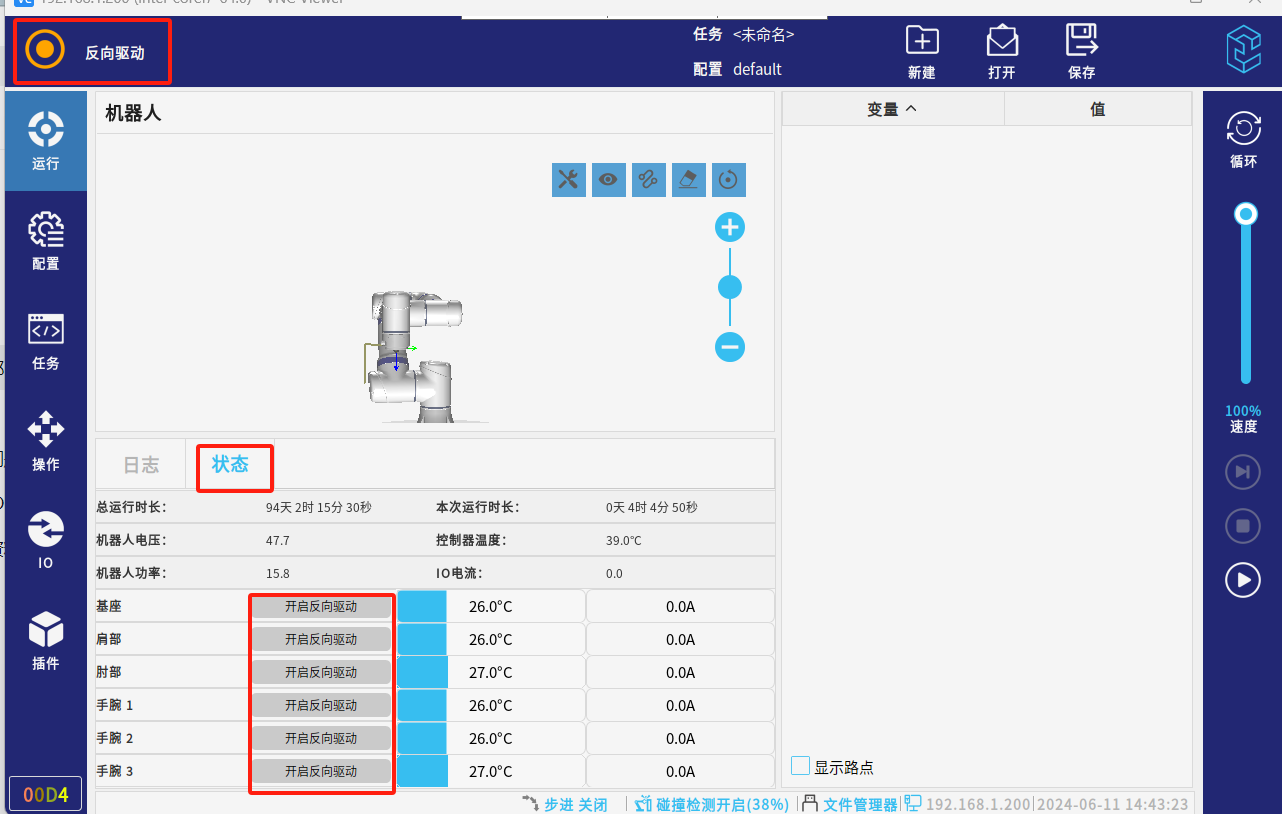 ● 開啟反向驅動后,電機釋放抱閘機器人對應關節,此時關節在重力的作用下,會正常下滑。開啟反向驅動前,必須做好安全防護,防止由于重力向下移動損壞設備。