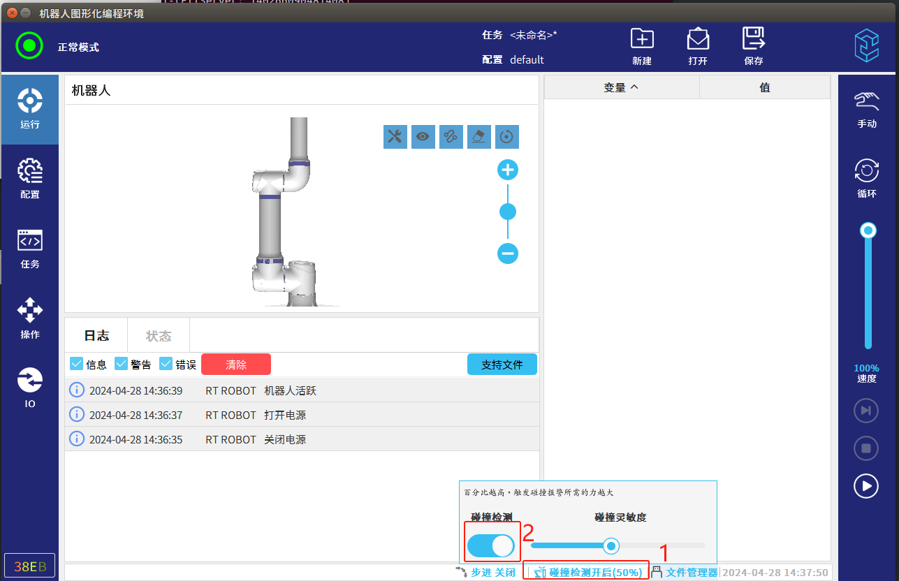 ● 關閉碰撞檢測時,必須盡可能減小機器人的運動速度移出碰撞區域,以避免不可預知的碰撞損傷。解決后需把碰撞檢測開啟。