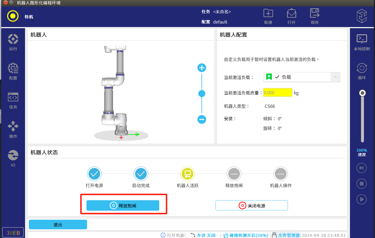 ● 將機器人移動到安全區域內,然后點擊 “釋放抱閘“。等待頁面左上角顯示“正常模式”,機器人可正常使用。