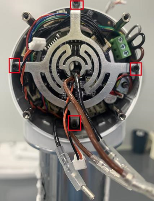 2.  拆下四顆螺絲后,將四角支架旋轉一點,可以看到剎車抱閘還有一顆外六角螺絲,并將此螺絲松開。注意:小心別把線束扯斷,如線束較緊,可以先把線束拆下,如上圖。