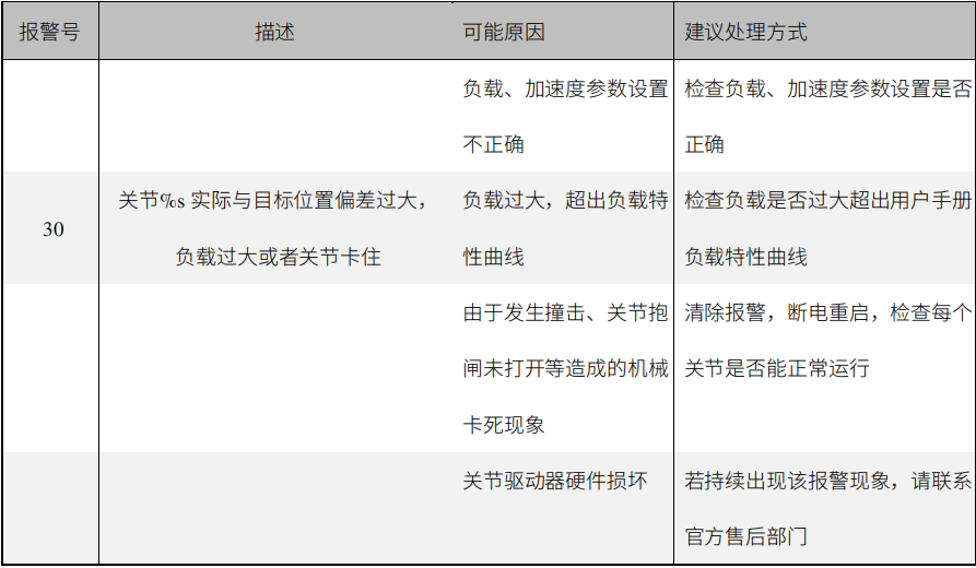 報警代碼:伺服故障碼:30,關(guān)節(jié)3實際與目標(biāo)位置偏差過大,負載過大或者關(guān)節(jié)卡住