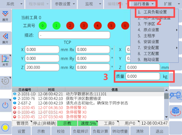 步驟一:排查機械臂負載是否設(shè)置正確。負載太大或者太小有報警30的風(fēng)險。可以在運行準(zhǔn)備界面-----工具負載設(shè)置界面,里面的質(zhì)量那里檢查負載參數(shù)。再堅持程序里面指令加減速是否正常。