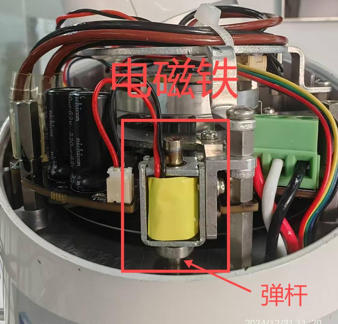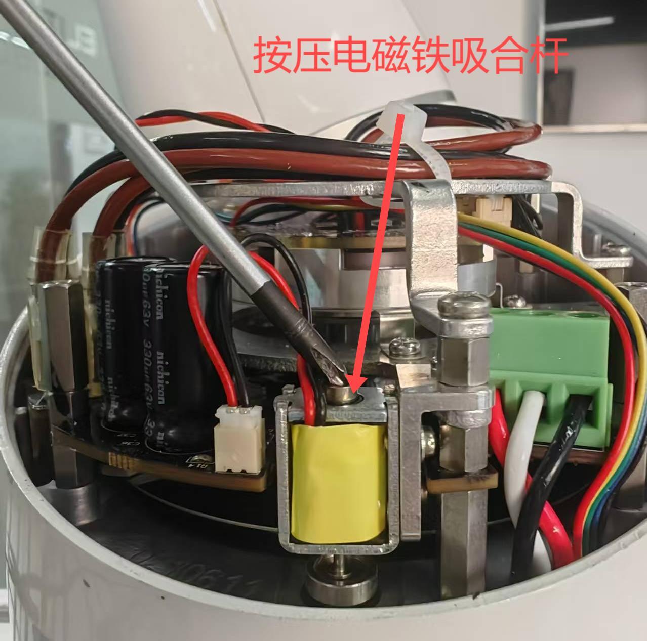 步驟三:檢查電磁鐵抱閘和減速機是否正常。1.關(guān)閉電源,將故障關(guān)節(jié)的端蓋打開,檢查電磁鐵的彈桿是否卡死或者彈桿掉落。