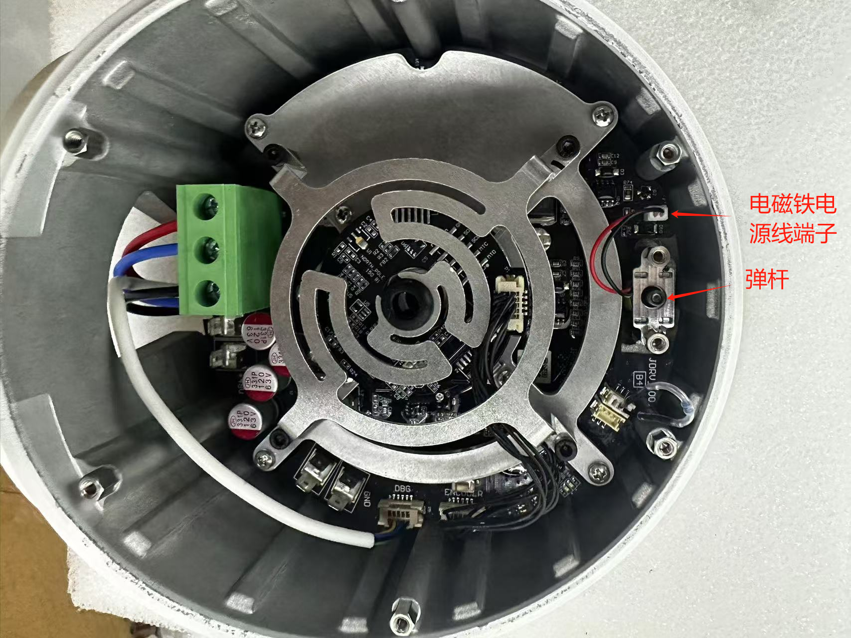按住剎車(下圖中彈桿的位置),將此關節轉動一定角度,然后機械臂上電,復位,若報警可以消除,此關節轉動一定角度,任然報警 60,無法消除,則為磁編碼器異常,需返廠維修,更換磁編碼器。