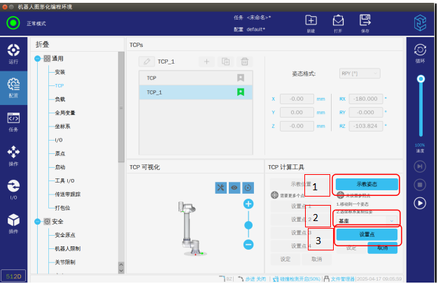 第三步:4個點設置好后,如圖-6所示,點擊設定,新建的TCP就設置好了。如圖-7兩個紅框標記所示,新建的TCP_1與基座標系方向不同。