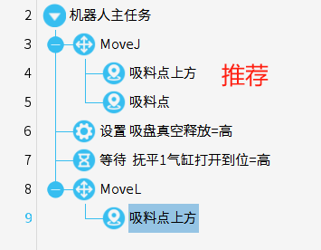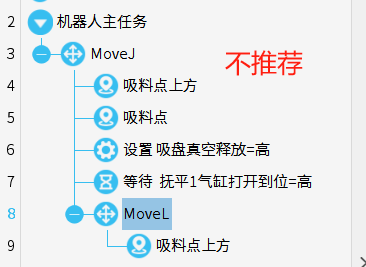 程序中move指令下只可以寫路點,不允許添加其他指令,如下上圖為推薦編寫規范,下圖為錯誤示范,注意對比和區分。