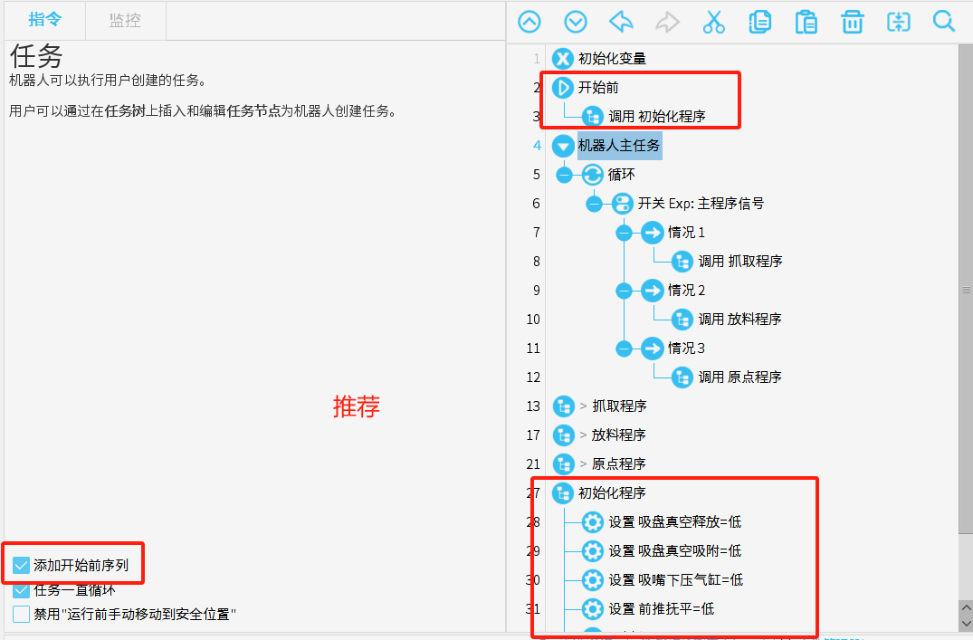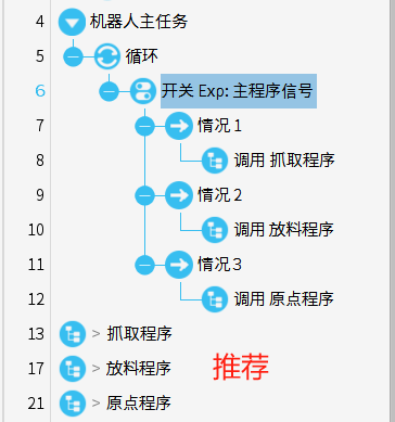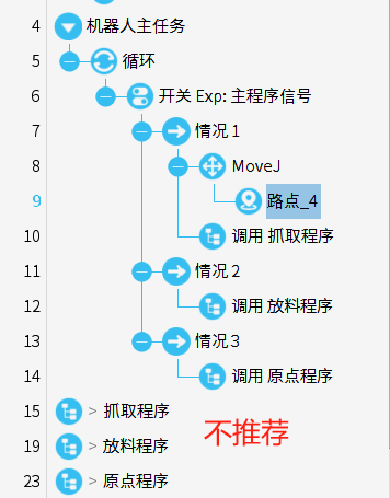 主程序使用,建議只寫邏輯指令,不建議寫運動指令,使用邏輯指令編寫主程序,可以簡化代碼,提高復用性和可維護性,使程序更靈活、易于理解和升級。