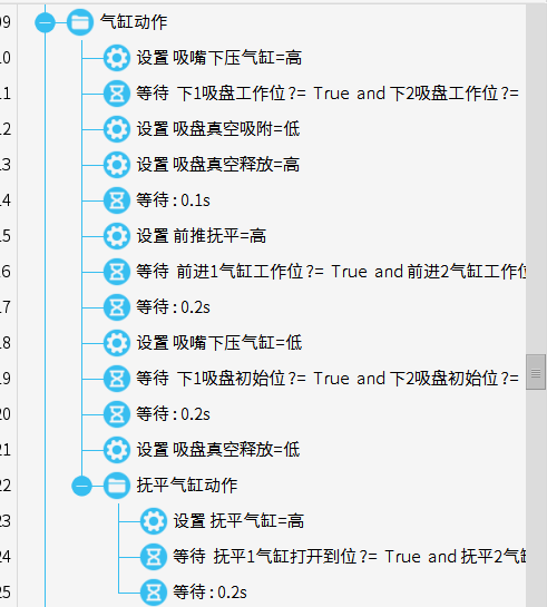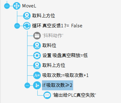 上面程序就是一個簡單的真空失敗程序,連續取料兩次,都無法真空的話,就輸出真空失敗報警。