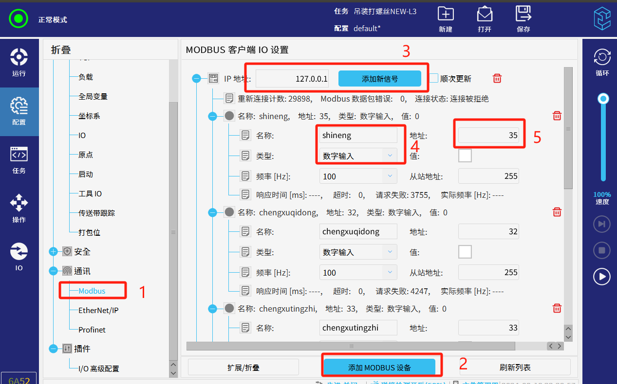 點擊機器人示教器配置--通訊--modbus--添加modbus設備,輸入ip(127.0.0.1屬于機器人內部mudbus從站內部地址)