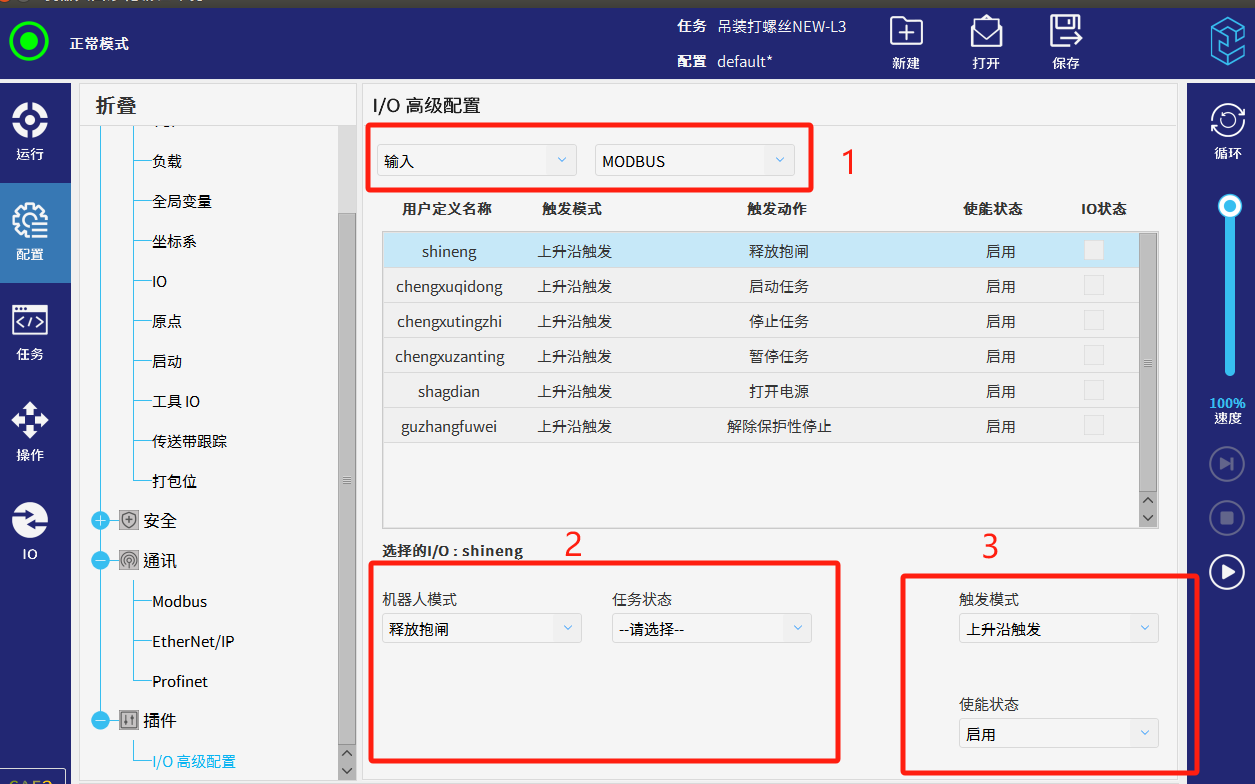 2. 選擇該信號需要實現的功能(如:機器人上電、下電、釋放抱閘、任務啟動等)