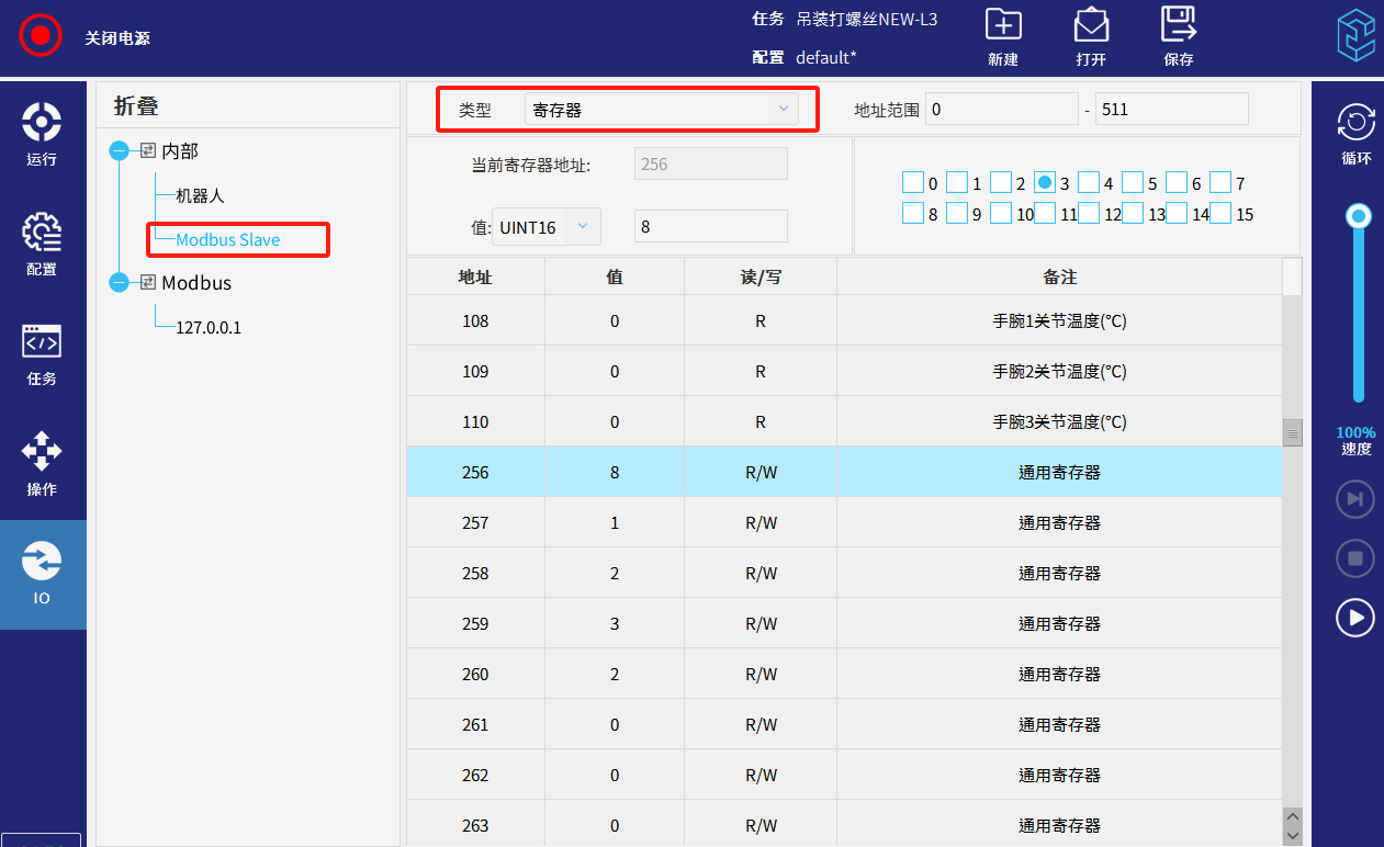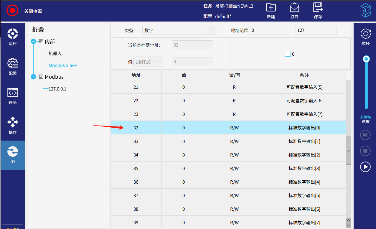 • 前期準備:1.機器手做為modbus從站并已通信上。2.已安裝I/O高級配置