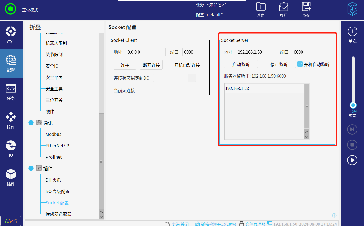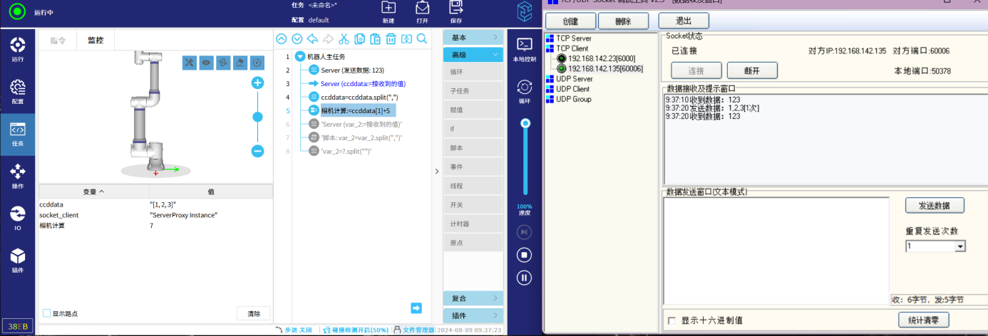 選擇導航欄“任務”-指令欄選擇“插件”-點擊"Socket Client"-設置該指令(勾選“連接”-輸入對應的服務端地址,端口號,“運行”或點擊"連接"即可)