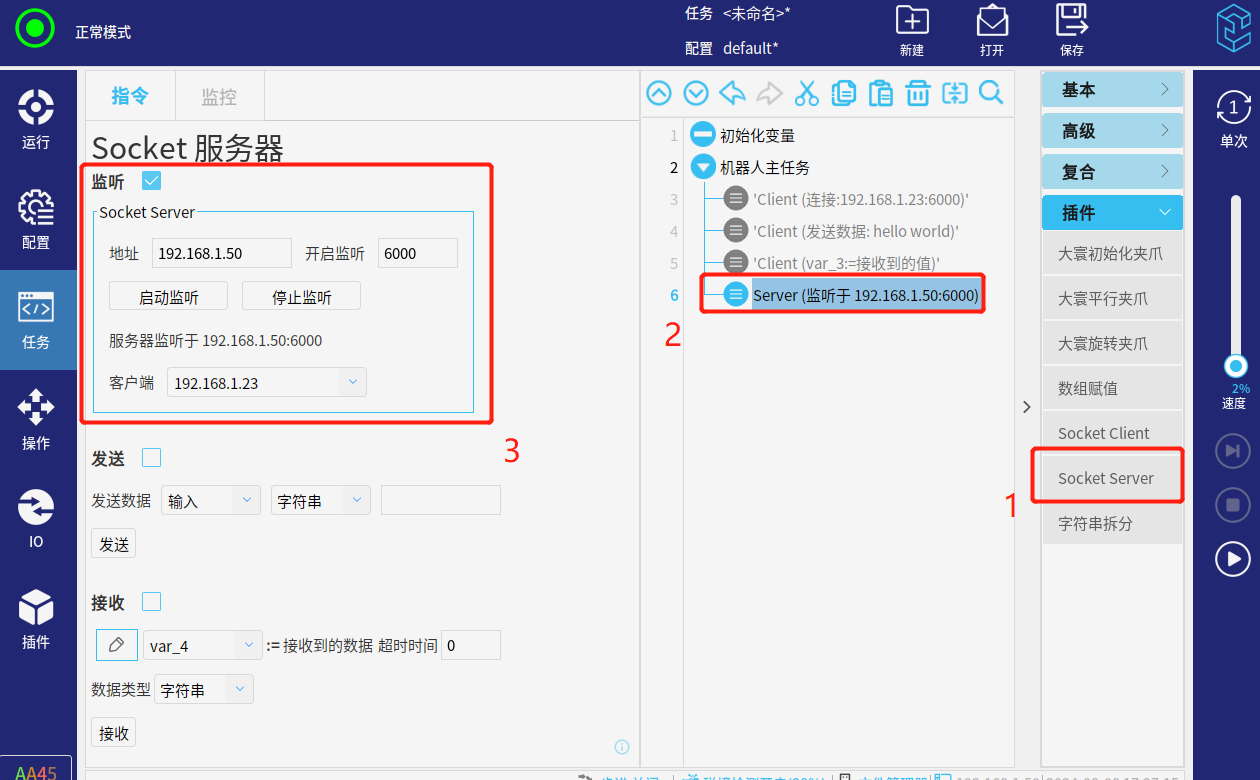 選擇導航欄“任務”-指令欄選擇“插件”-點擊"Socket Server"-設置該指令(勾選“監聽”-輸入對應的服務端地址,端口號,“運行任務”或點擊"監聽"即可)