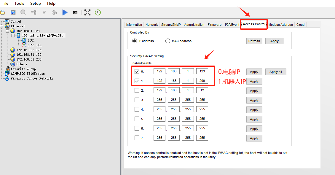 設置完成后點擊下圖,勾選前面方框,設置能夠控制模塊的IP地址,設置完成后點擊Apply。