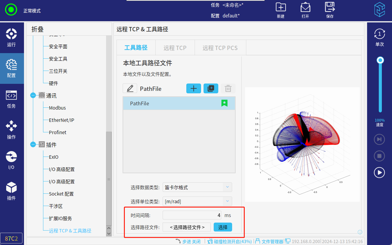 3.以上操作完成后,就可以運行程序了。初次運行,速度百分比調低一點,插件參數設置的不對,運行過程中可能會有抖動。