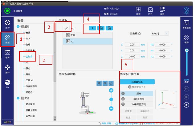 第二步:進入機器人配置→坐標系→添加新的用戶坐標系(新坐標系命名需要是英文)→示教坐標系。(具體操作步驟請看圖-1紅色數字標記處)