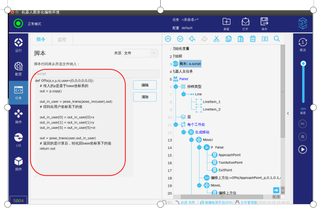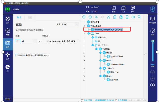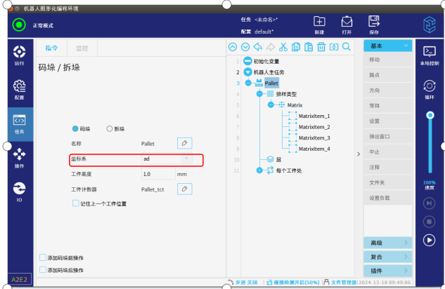 第二步:使用pose_trans函數將坐標系ad按照得到的偏移值進行偏移(如圖-3紅框標記處),這樣碼垛工藝包里的碼垛點也會隨著坐標系ad的偏移而偏移。