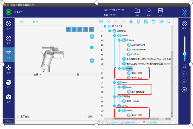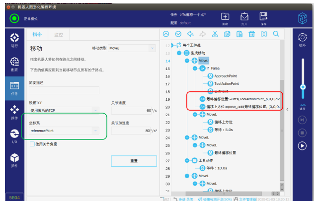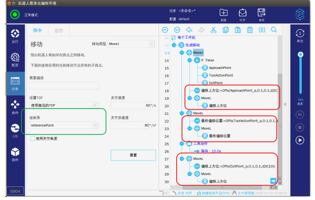 3. 使用2.2(方法2)進行偏移時要重新插入一個movel運動指令,然后將偏移點位放在新插入的運動movel指令下(如圖-6和圖-9紅框標記所示)。