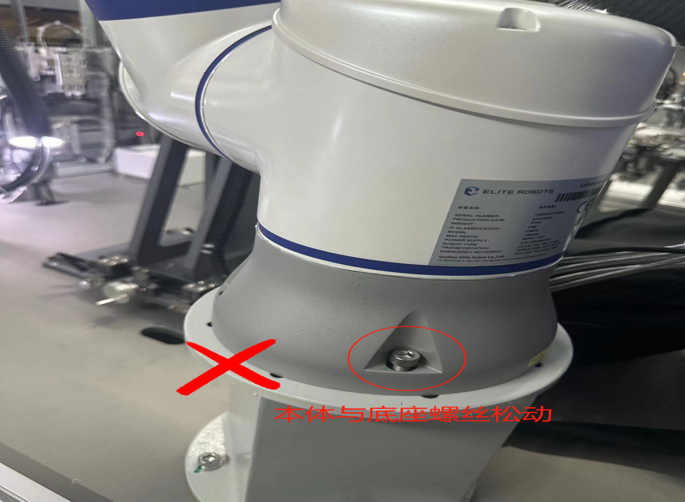 檢查機器人本體上的螺絲是否松動或丟失、機器人末端的工具是否有松動,工作臺是否本身就抖動,機器人會因為震動而對緊固件產生振動,長時間運動后螺絲可能會松動或者丟失,導致機器人抖動。如圖2-1-1所示機器人本體與底座的螺絲松動。