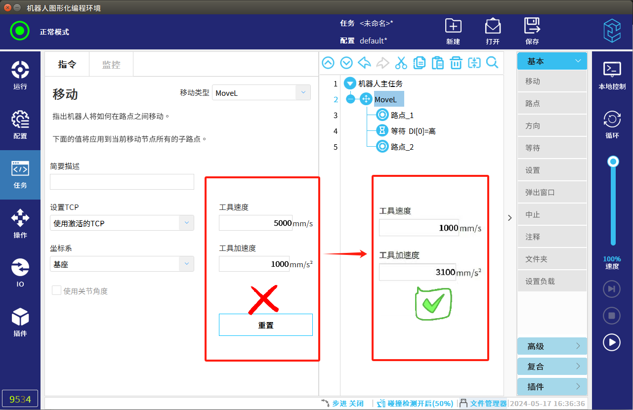 4.調試過程中速度盡量放慢,碰撞檢測要打開,避免發生碰撞機器人發生抖動。