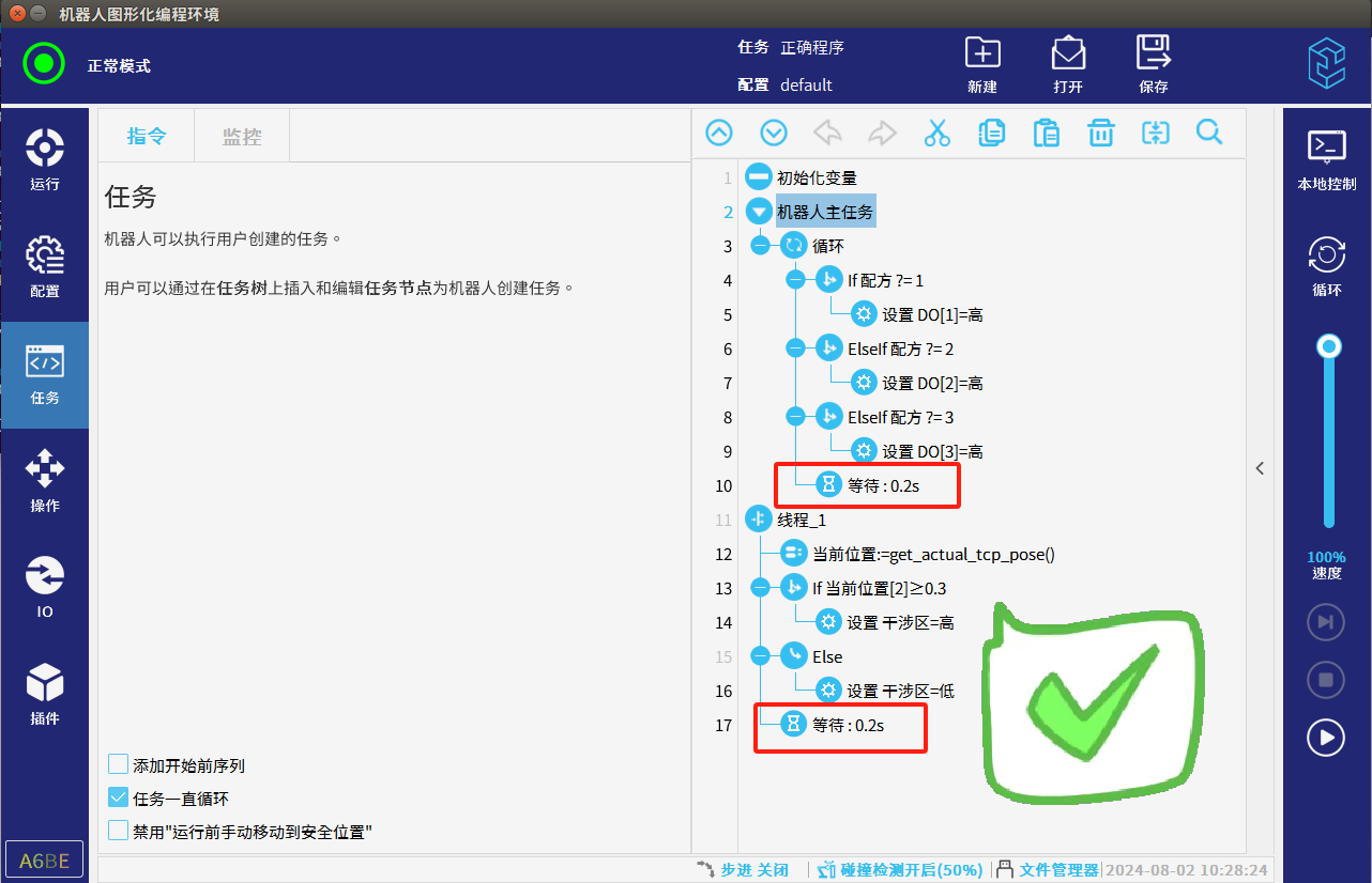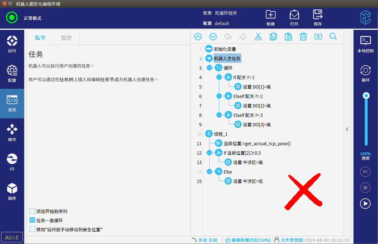 檢查程序中是否有死循環會導致機器人CUP過載,CPU過載也會導致機器人抖動,例如程序中一直if循環判斷且條件多次不滿足的時候程序會進入死循環,使用線程時線程中沒有加等待時間程序也會進入死循環如圖3-2-1,應該在循環/線程中加等待時間避免出現死循環CPU過載后導致機器人點到點抖動如圖3-2-2所示。