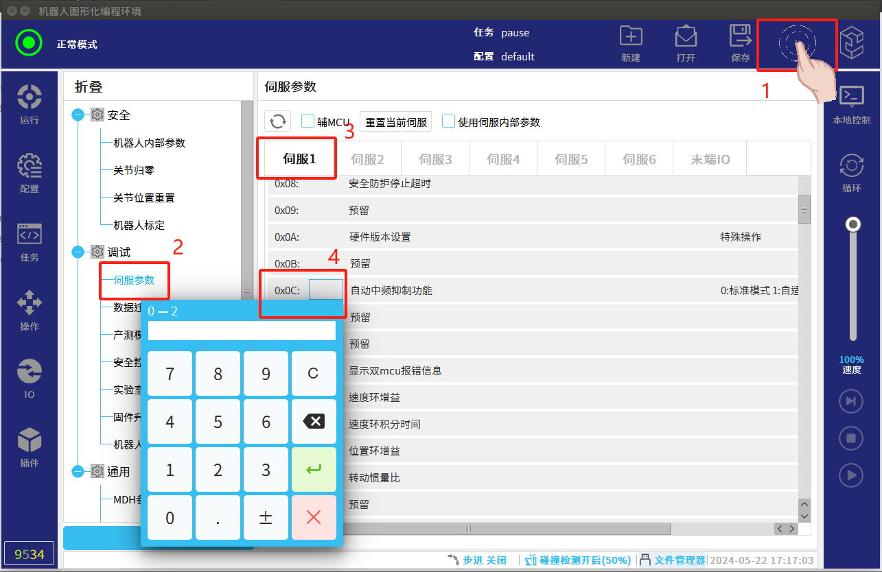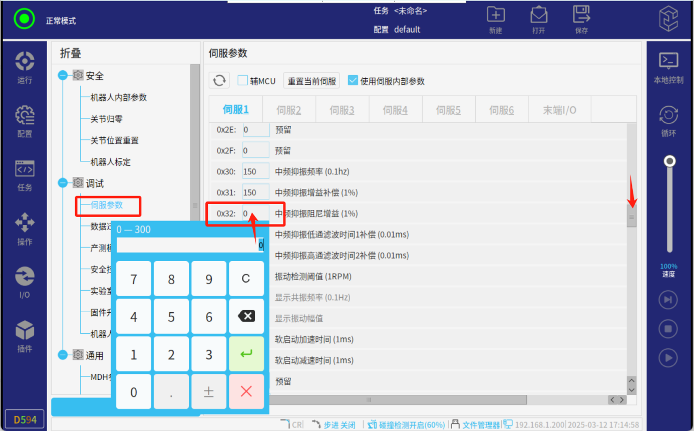 通常在出廠時,Pn0C 被設定為 0,即標準抑制模式,振動抑制參數均由控制 器下發。在后續使用機器人的過程中,若出廠設定的默認參數對于實際工況下的 抖動抑制能力達不到特定需求時,則可通過調整伺服參數Pn0C 進行自動低頻抖 動抑制。