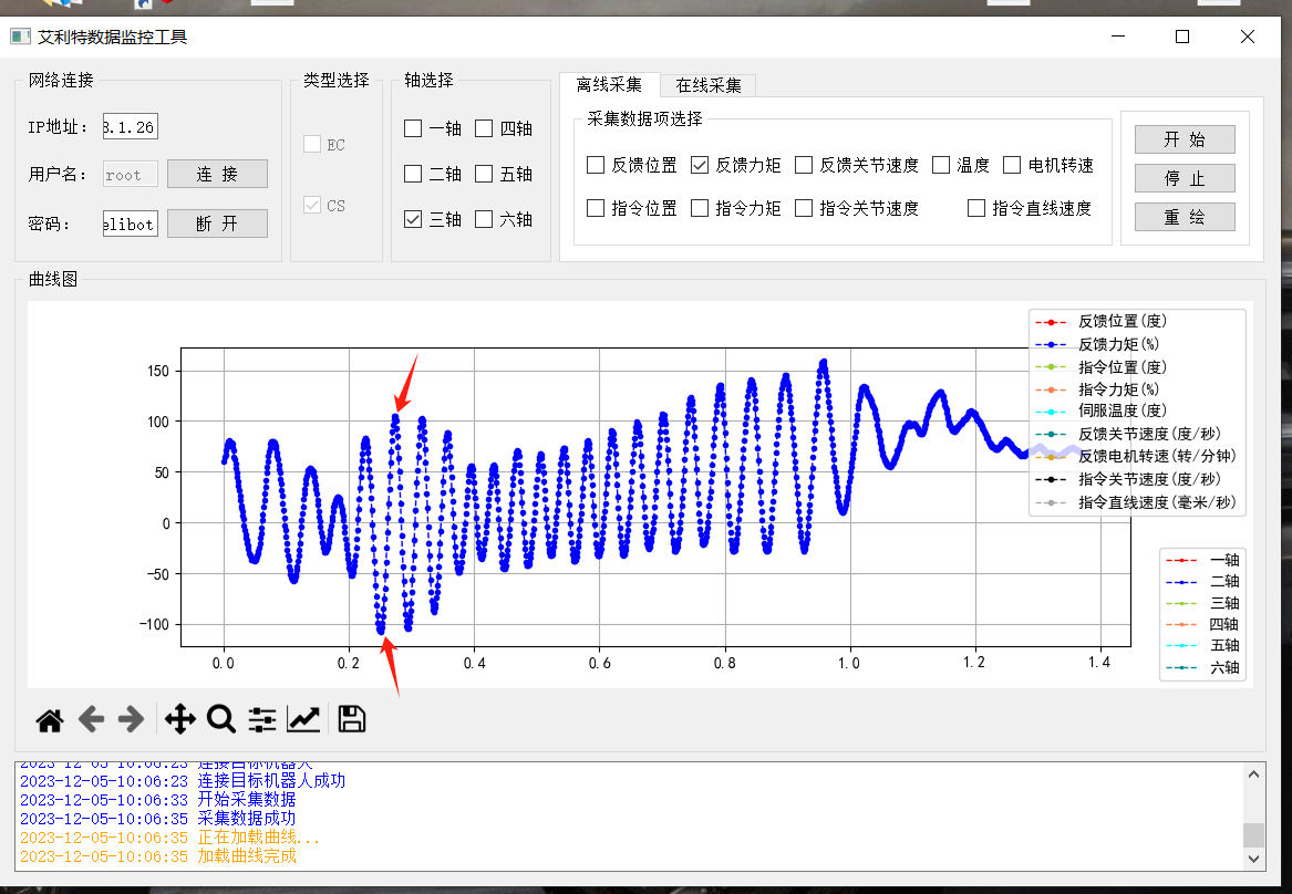 1.通過EliteMain進行數據采集并觀察每個軸的轉矩波形,當波形中出現 抖動較大的情況時,測量該頻率;(EliteMain軟件需聯系艾利特技術人員獲取)