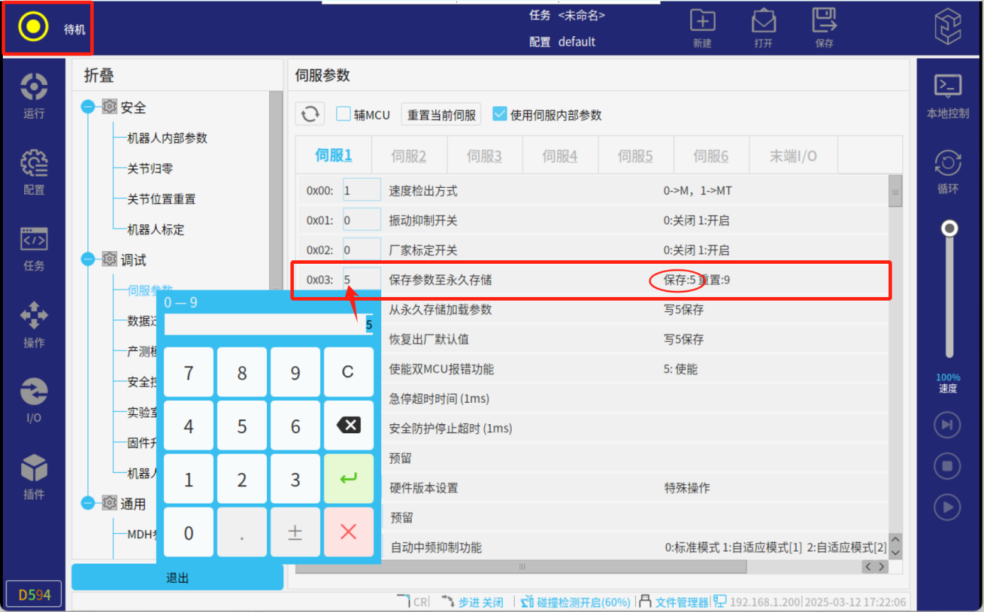 6、調整好參數后,需要保存至伺服,否則再次上電調整好的參數會丟失,Pn03參數寫入5進行保存,機器人顯示待機狀態說明保存成功。