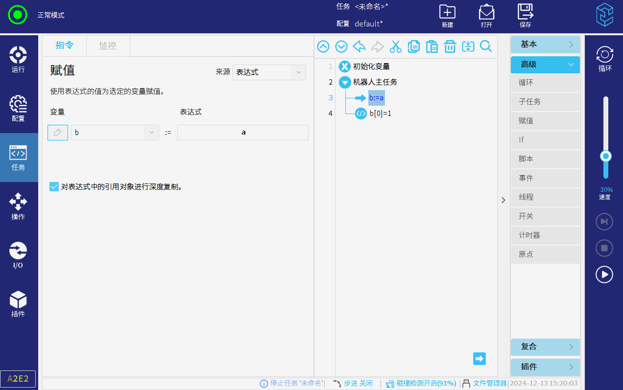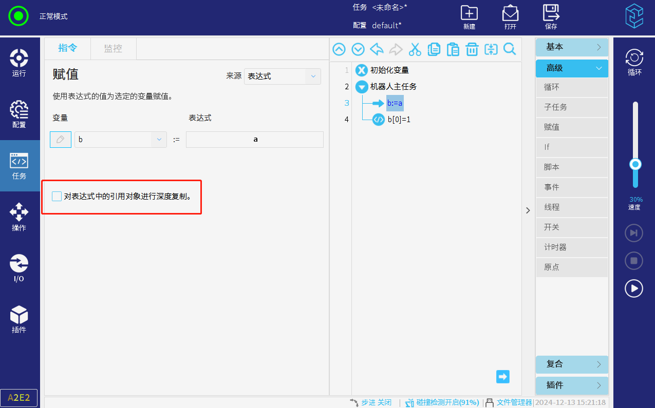 任務(wù)中添加下圖程序程序,將數(shù)組a賦值給數(shù)組b,再修改b數(shù)組的值,不勾選深度賦值