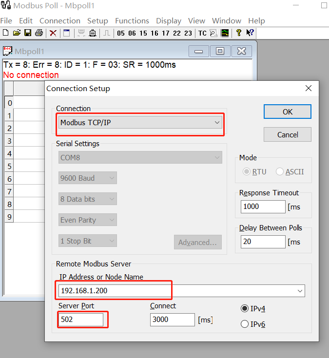 打開第三方網絡調試助手modbus poll,--connection--connect,選擇modbus tcp/ip,ip地址欄輸入機器人的ip,端口默認502,最后點擊ok
