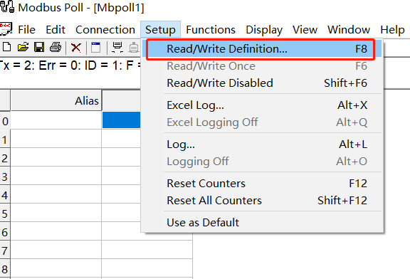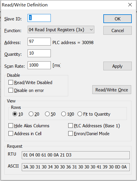 可以在setup--read/write definition 選擇04 read input register,地址address256,數量10,先讀這些可讀可寫的寄存器方便我們觀察變化
