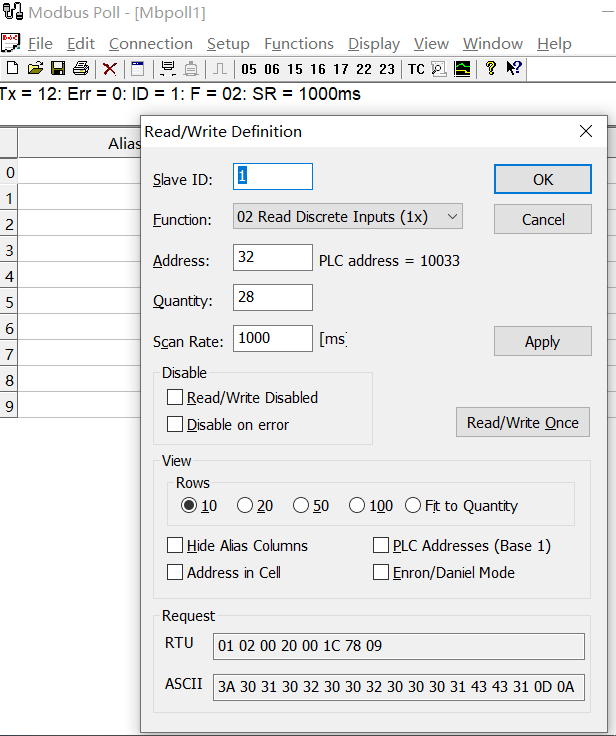 輸入下圖的id,功能碼,地址,數量,點擊ok