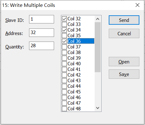 點擊functions--選擇功能碼15:write multiple coils(寫多個線圈),勾選所需的coil,點擊send,回復respons ok 即可輸出信號