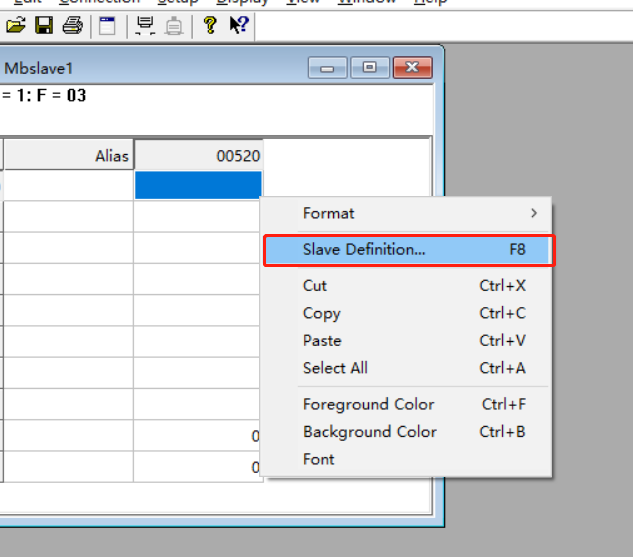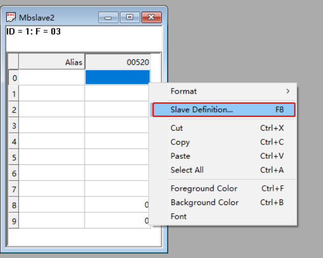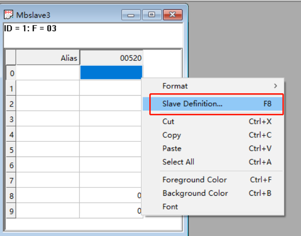 打開modbus slave調試助手,右擊名為“mbalave1”窗口,點擊slave definition,