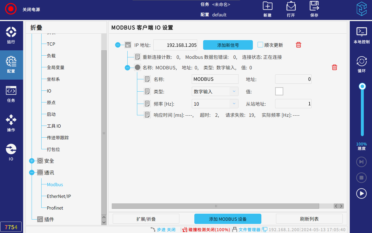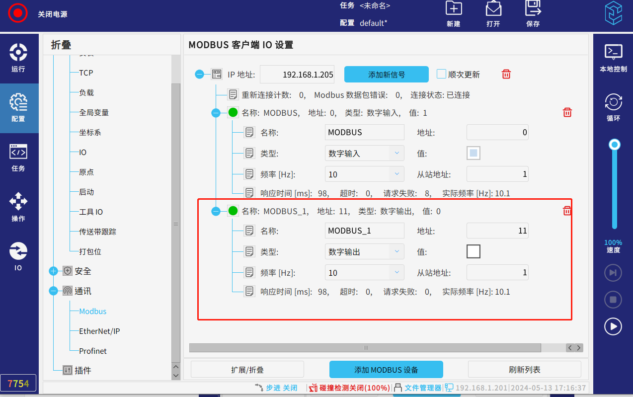 點擊機器人示教器配置--通訊--modbus--添加modbus設備,輸入ip(此處ip為主站ip)