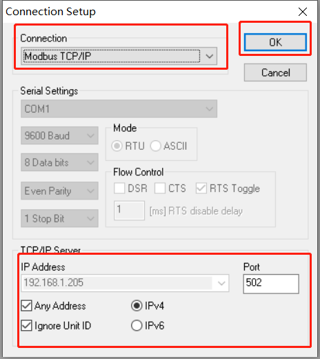 打開 modbus slave 調試助手,點擊 connection--connect,如下圖設置后點擊ok