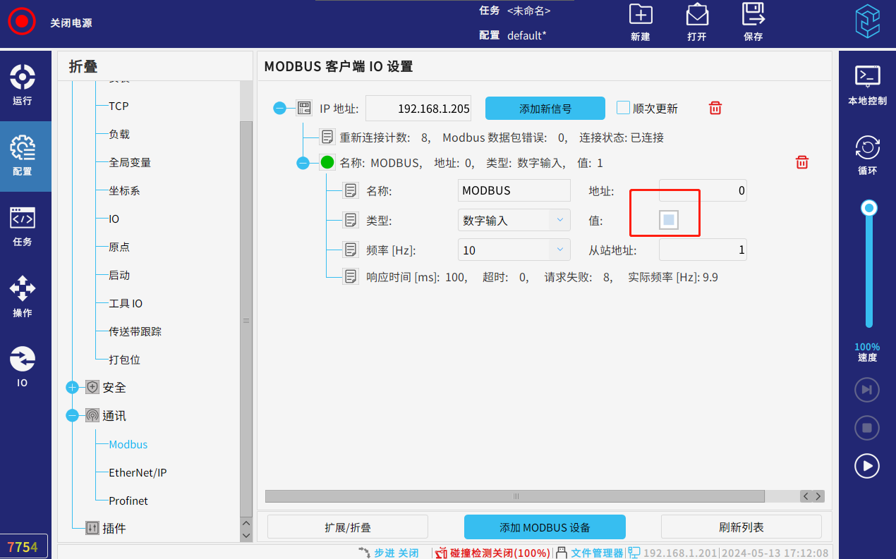 點擊示教器頁面,輸入類型-數字輸入 地址為0從站地址可為1,頻率10(可選),當圖標變為綠色即ok