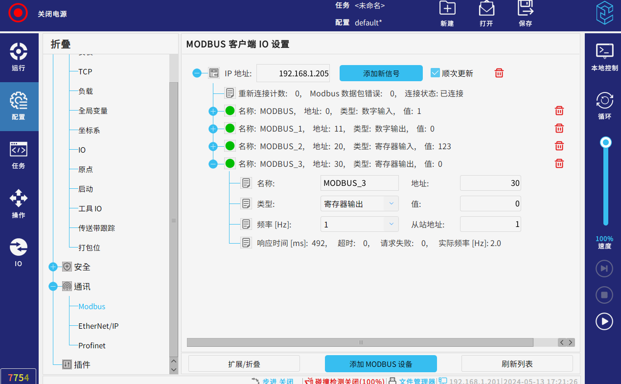為方便在modbus信號在程序中方便配置和使用,可以在配置--通訊--modbus連接機器人自己作為主站