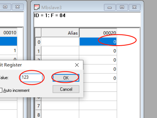 可在modbus slave界面,點擊對應地址輸入數值,
