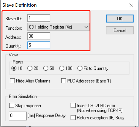 選擇id 1,function03,地址30,數量5(自定義),點擊ok