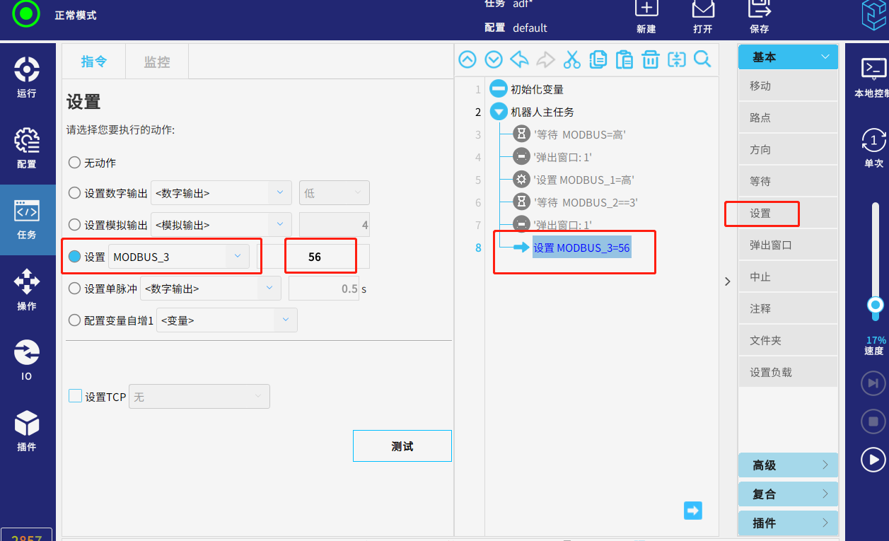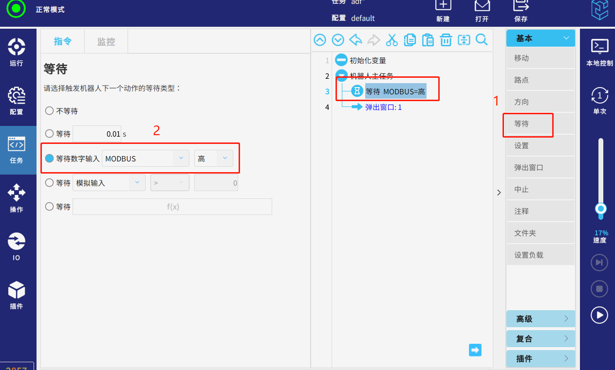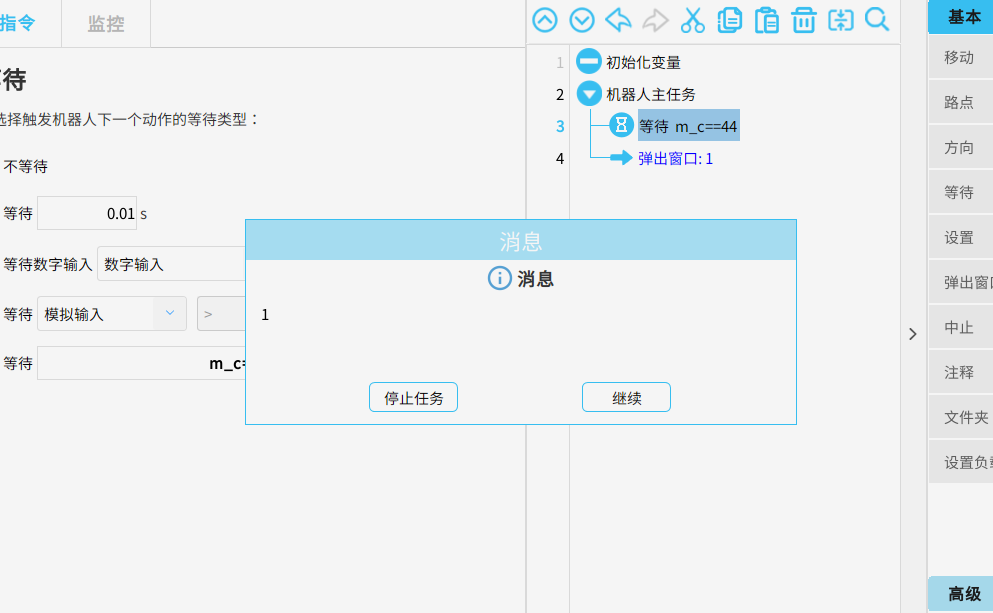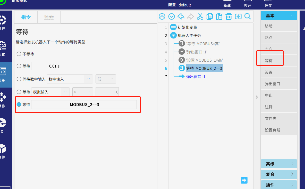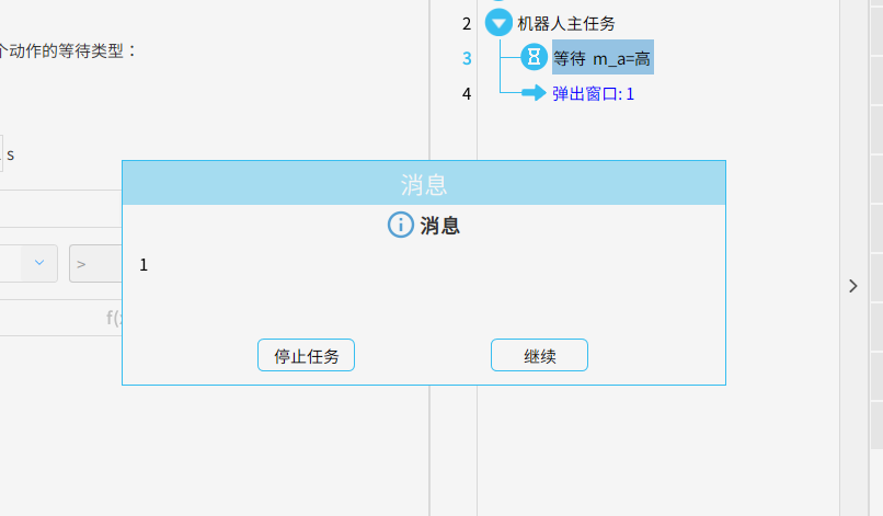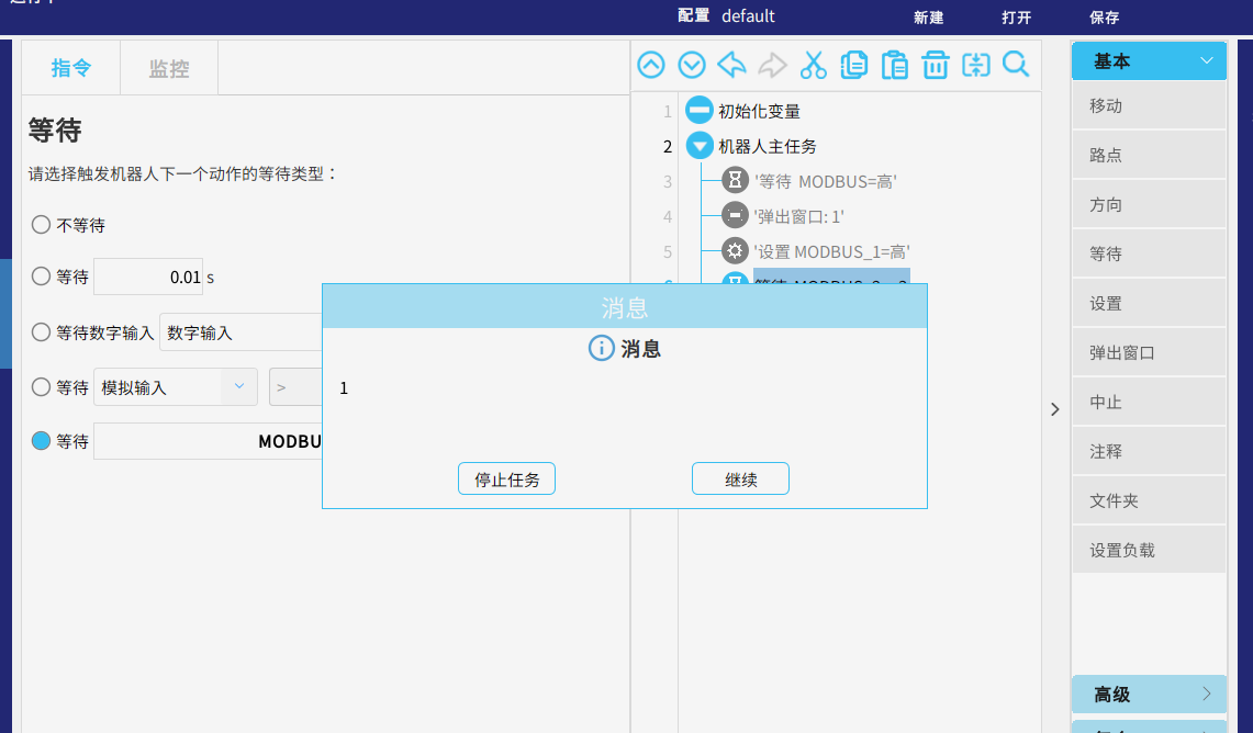 運行任務,當從站的信號modbus_2=3 時 ,頁面彈出窗口提示“1”,代表已獲取到該寄存器的值