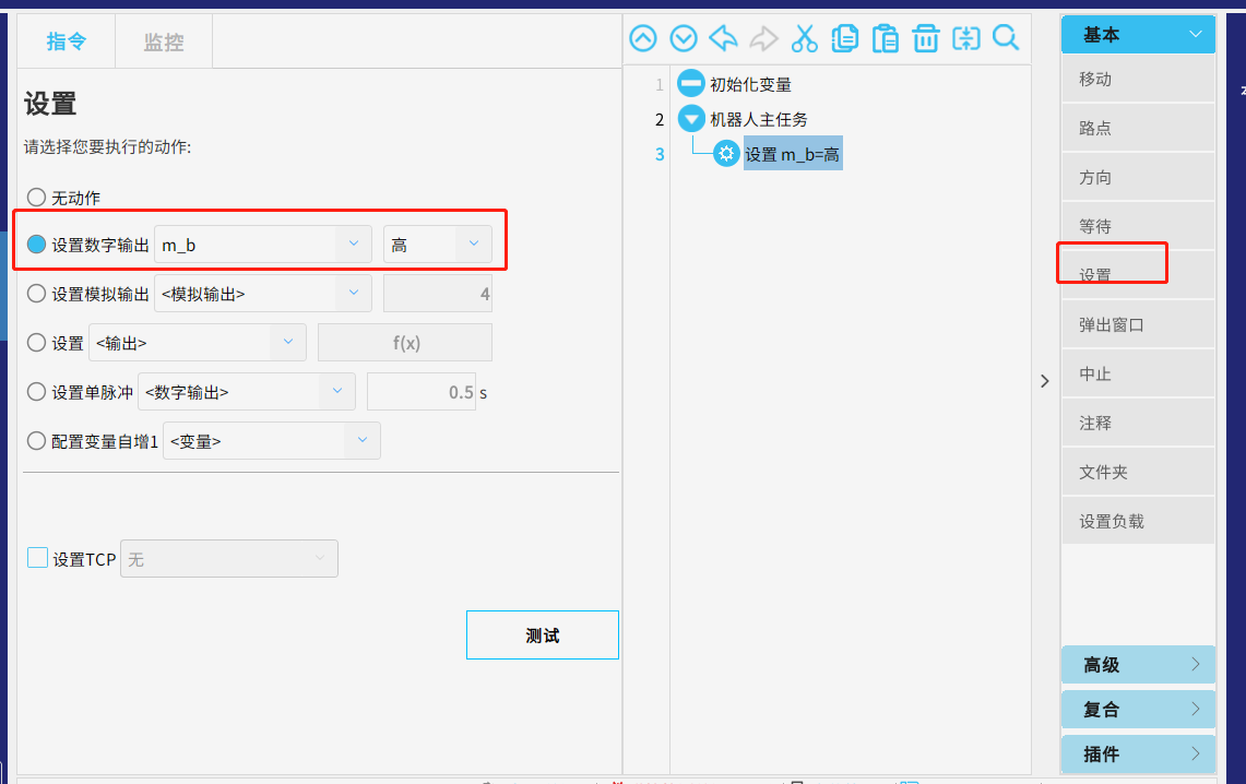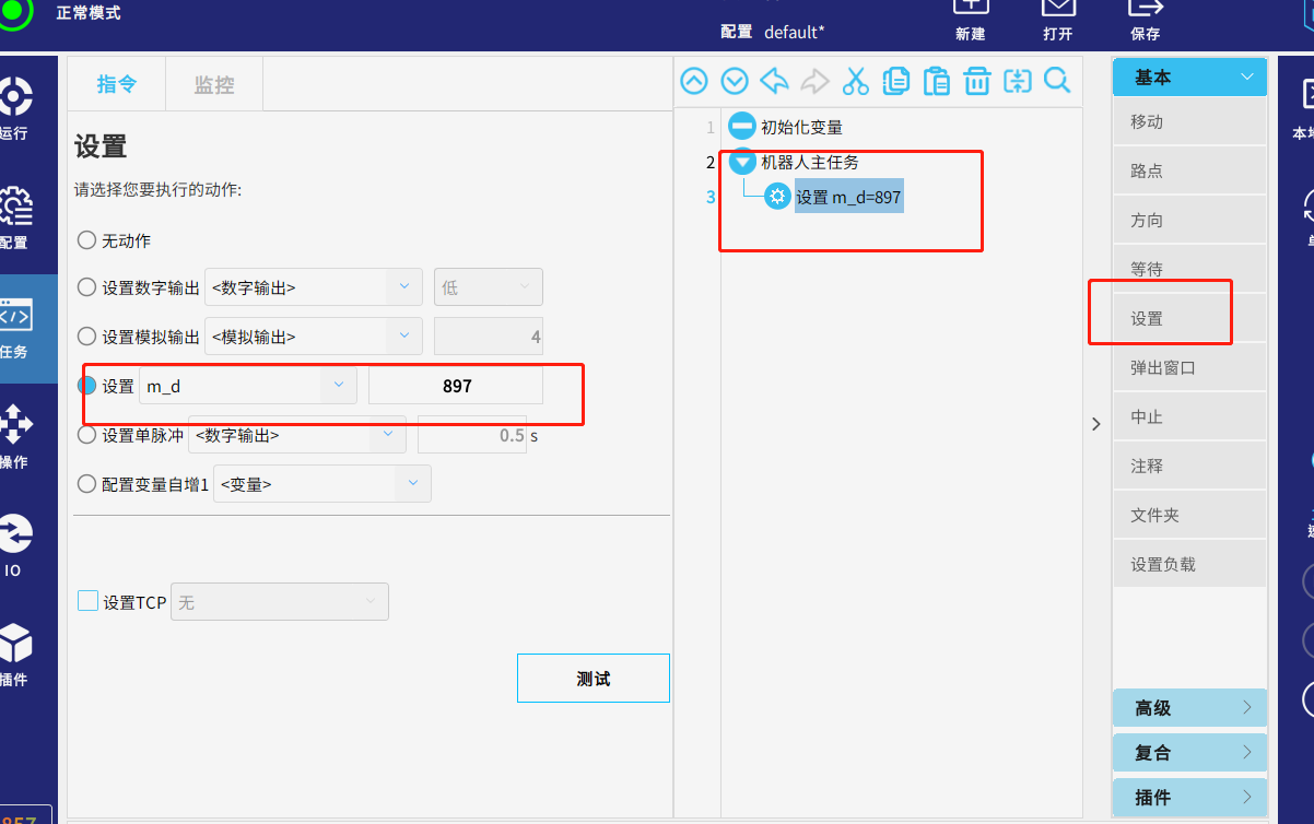 機器人中如上圖設置,點擊運行,調試助手中顯示為1,即成功